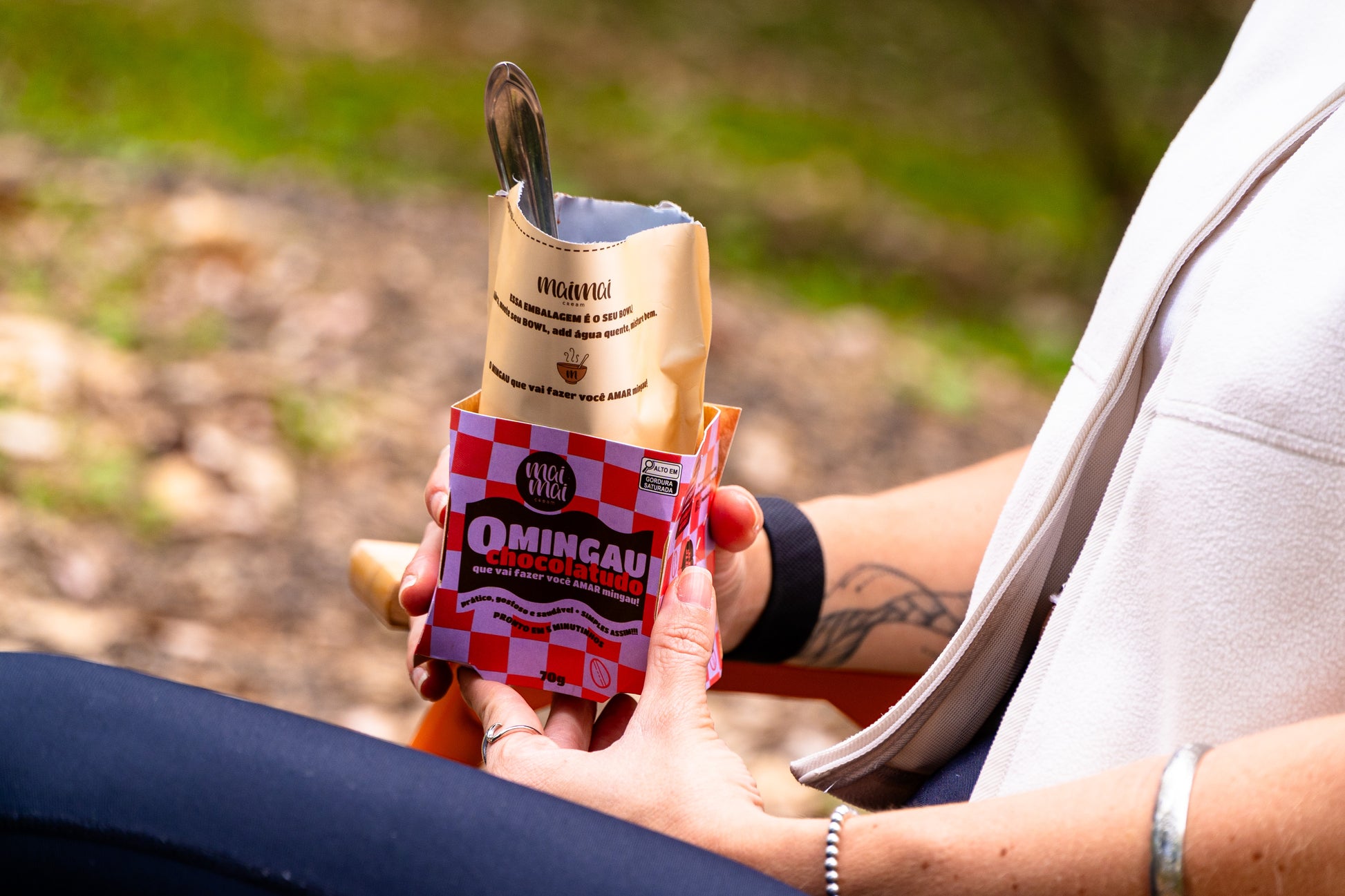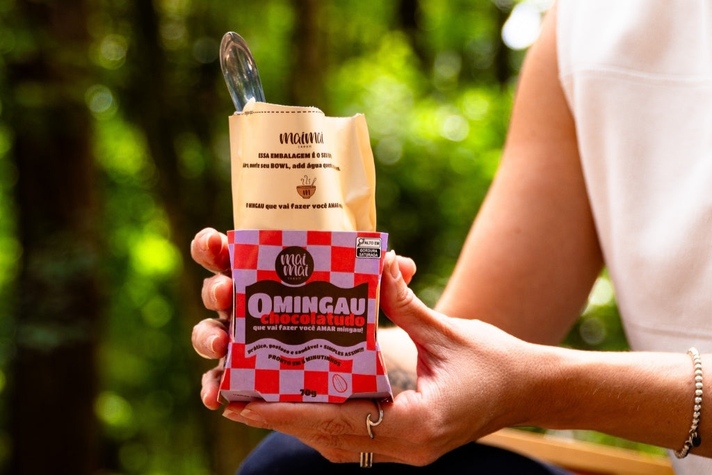 O Chocolatudo MaiMai é feito com pedacinhos de chocolate vegano que derretem no preparo e deixam cada colherada ainda mais deliciosa.